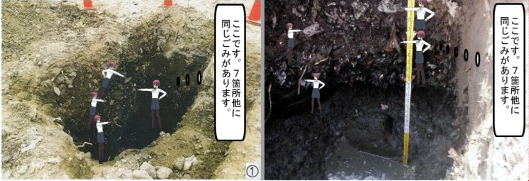 だが両者の写真を照合すると写真①の地面から約1mほど下がったところのゴミの層と右側の試掘時写真のゴミの層が一致する。(銀杏型のごみから上下左方向に7箇所他) ゴミの層は動かないことから、ゴミの層は地面から約1.8m、粘土層約1.2m即ち掘削深度3mとなる。報告された掘削深度は4mであるので1m偽装されたことが判明した。