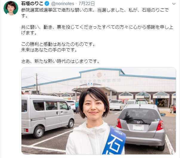 石垣のりこ氏は、選挙期間中あの安住元財務相をひきずって激戦を制し当選を果たしました。