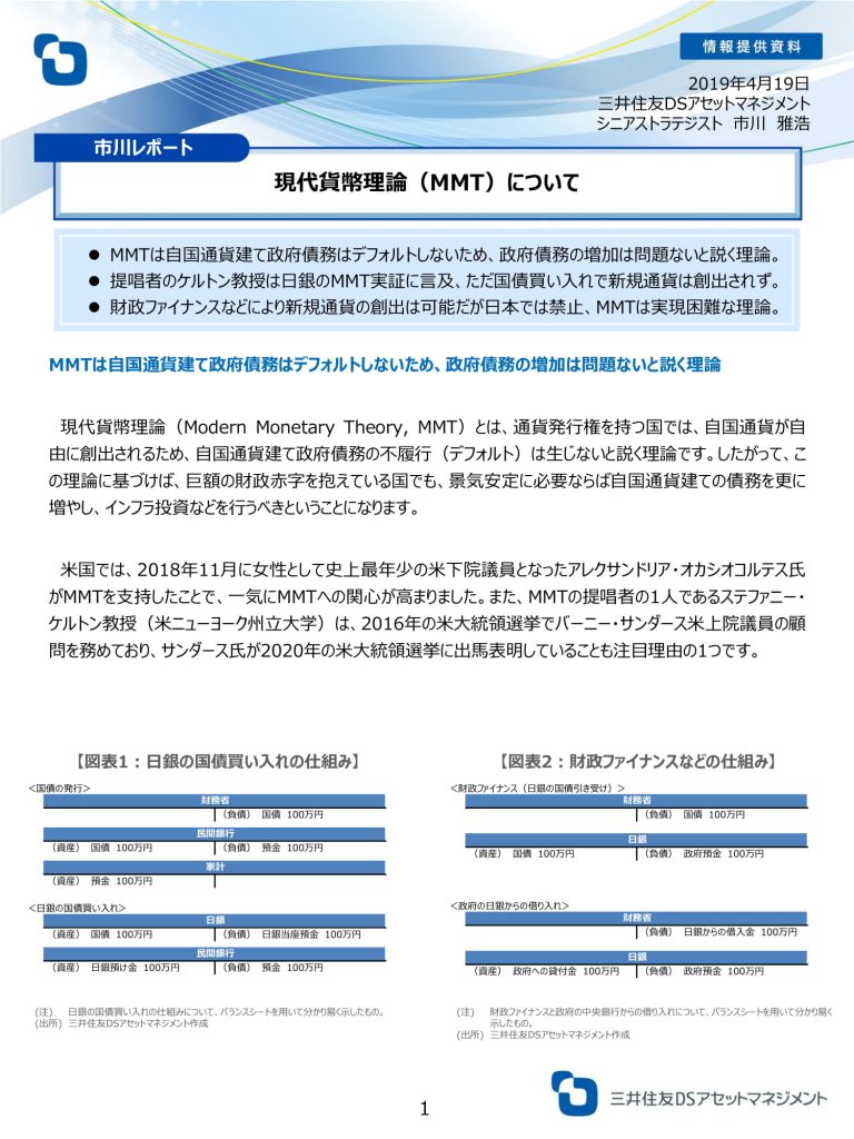 民間銀行が財務省発行の国債を購入する場合、購入原資は主に家計の預金です。拡張的な財政政策は2020年の米大統領選挙でも争点になる可能性がありますが、MMTは実現困難な理論と思われます。 (三井住友DSアセットマネジメント)